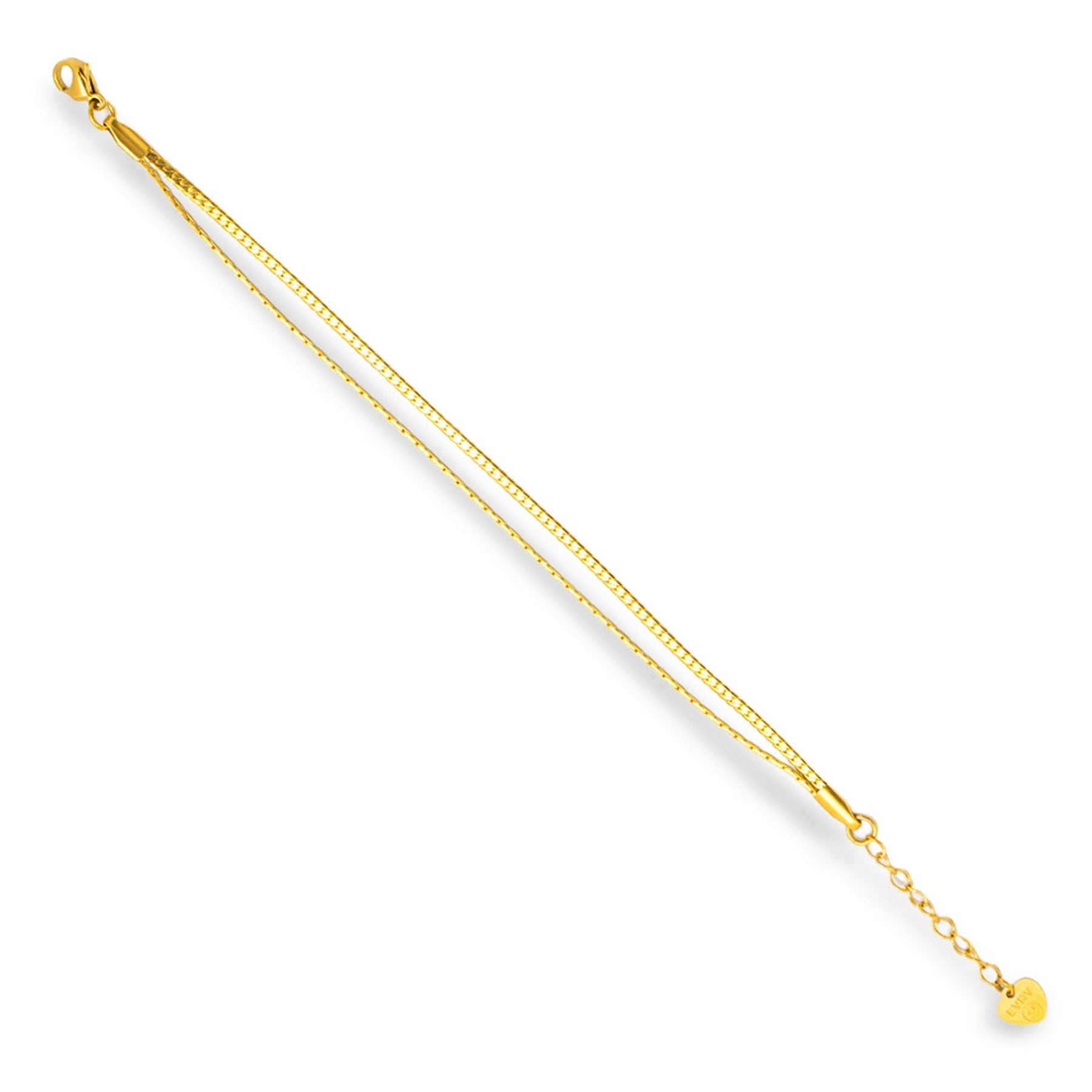 Understated and refined, this dual strand bracelet features two delicate box chains that add subtle texture and movement to your wrist stack. Perfect for everyday wear or layering with your favorite bangles and cuffs, it's a timeless piece that brings just the right touch of polish to any outfit.
