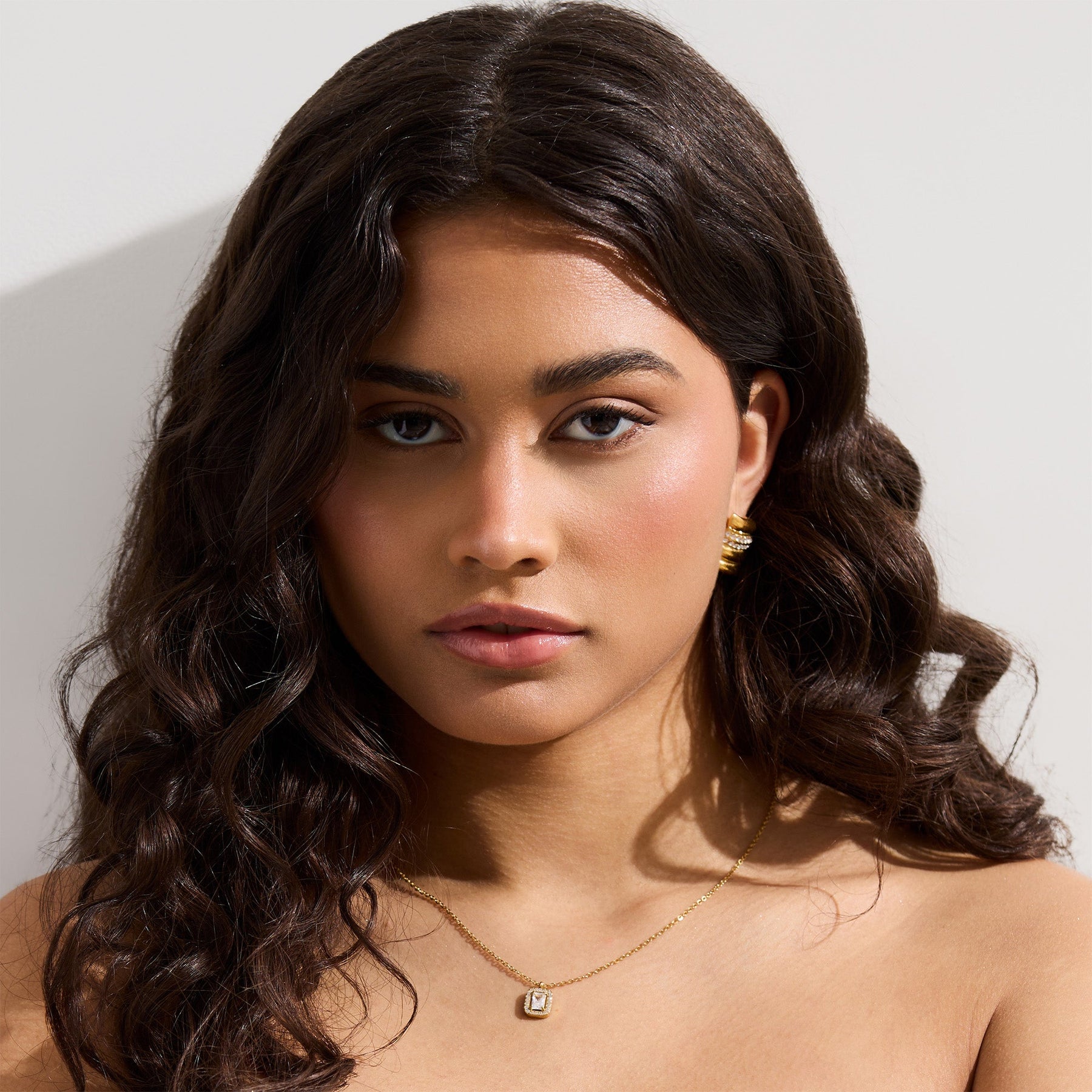 When you need jewelry that shines as bright as you do, reach for the You’re Glowing Necklace.  An emerald-cut center crystal is surrounded by a halo of pavé stones—framed in polished gold—for a look that’s all about luminous elegance.